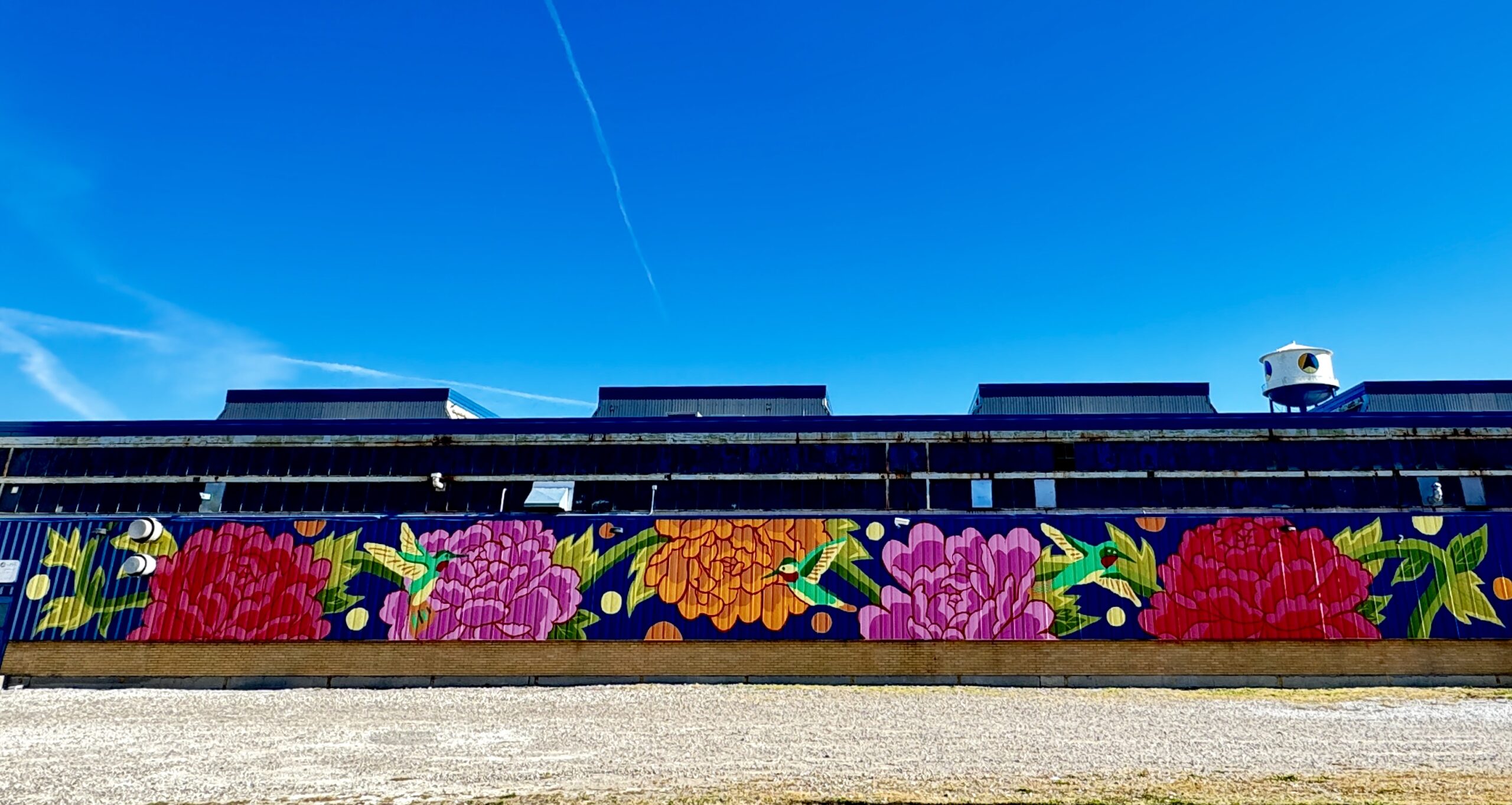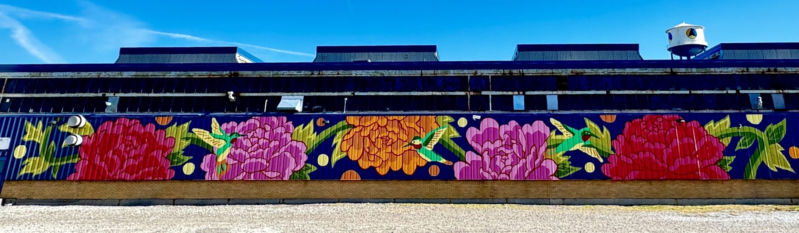 Take Flight, designed by Indianapolis-based artist Julie Xiao, brings a moment of color and calm to East Street in the Garfield Park neighborhood. Featuring peonies and hummingbirds — symbols of joy, beauty, and perseverance — the mural offers a bright visual pause for drivers, pedestrians, and families passing through the area. Commissioned by Tube Processing Corporation and created in partnership with Big Car Collaborative, the mural was painted with support from Ess McKee and Big Car staff.