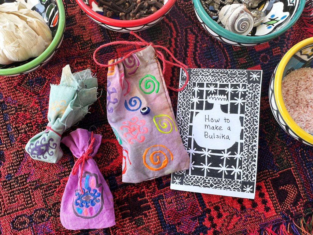 Throughout the Jewish diaspora, people have created small pouch amulets to hold anything with protective energy and value. These are often made with everyday materials already on hand: medicinal plants, salt, metal, stones, and symbolic objects. The recipes and the names for these amulets vary by place. In Ladino-speaking Sephardic communities, they are called “bulsika” and in Yiddish-speaking Ashkenazi communities, “baytelech.” The ingredients connect us to our ancestors, the environment, and the places we live. The pouch can be worn on the body, kept in a pocket, or hung up in the home. Come make an amulet for yourself or as a gift for someone else, as an embodied ritual of care, connection, and protection.