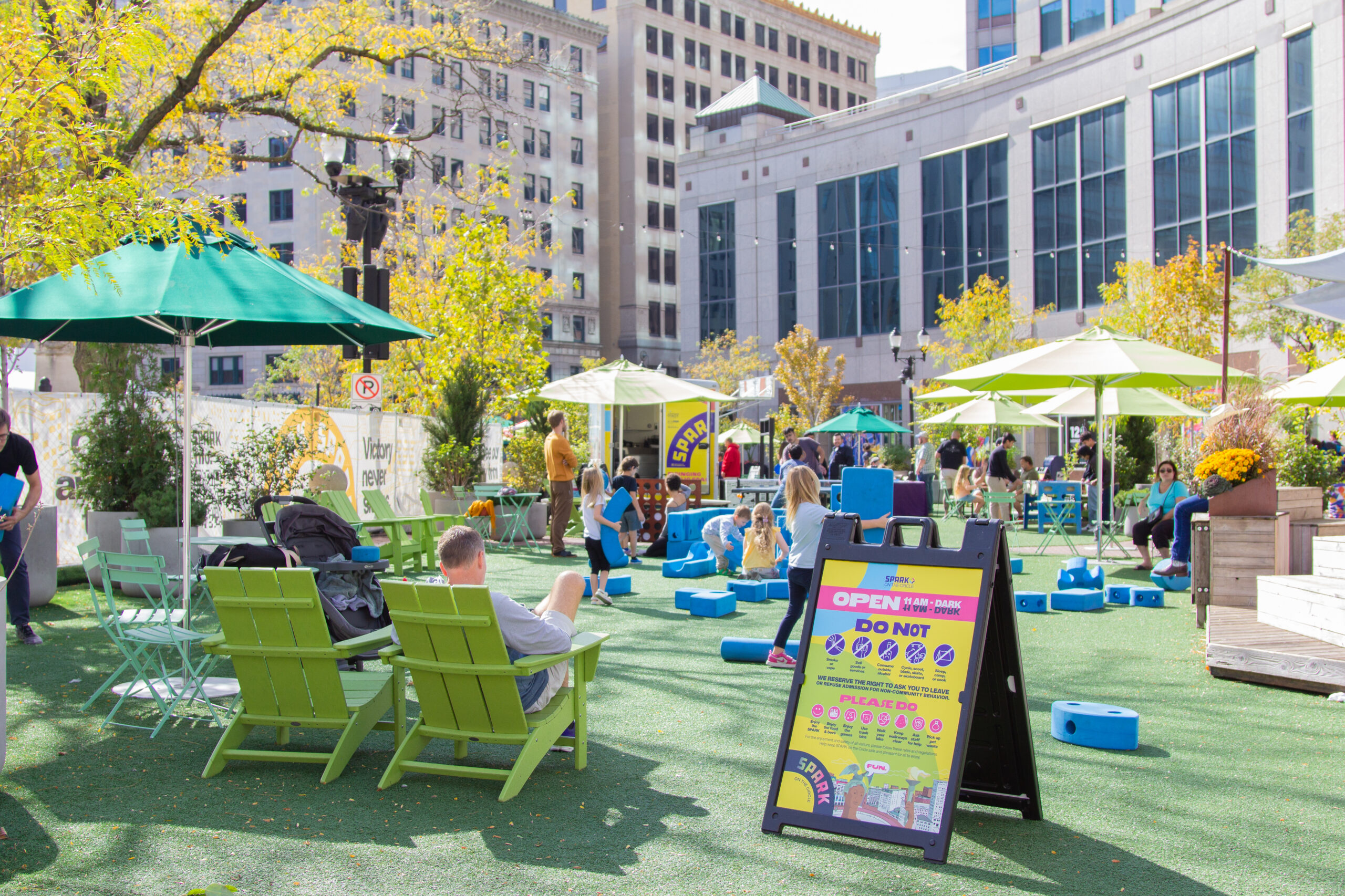 At Big Car, we approach our work at the Circle as a site- and community-specific socially engaged art and creative placemaking project. The SPARK on the Circle pop-up park was collaboratively designed with Indianapolis-based Merritt Chase to be a restorative public place where people of all walks of life can relax, play, socialize, and engage with art and artists in the heart of our city.