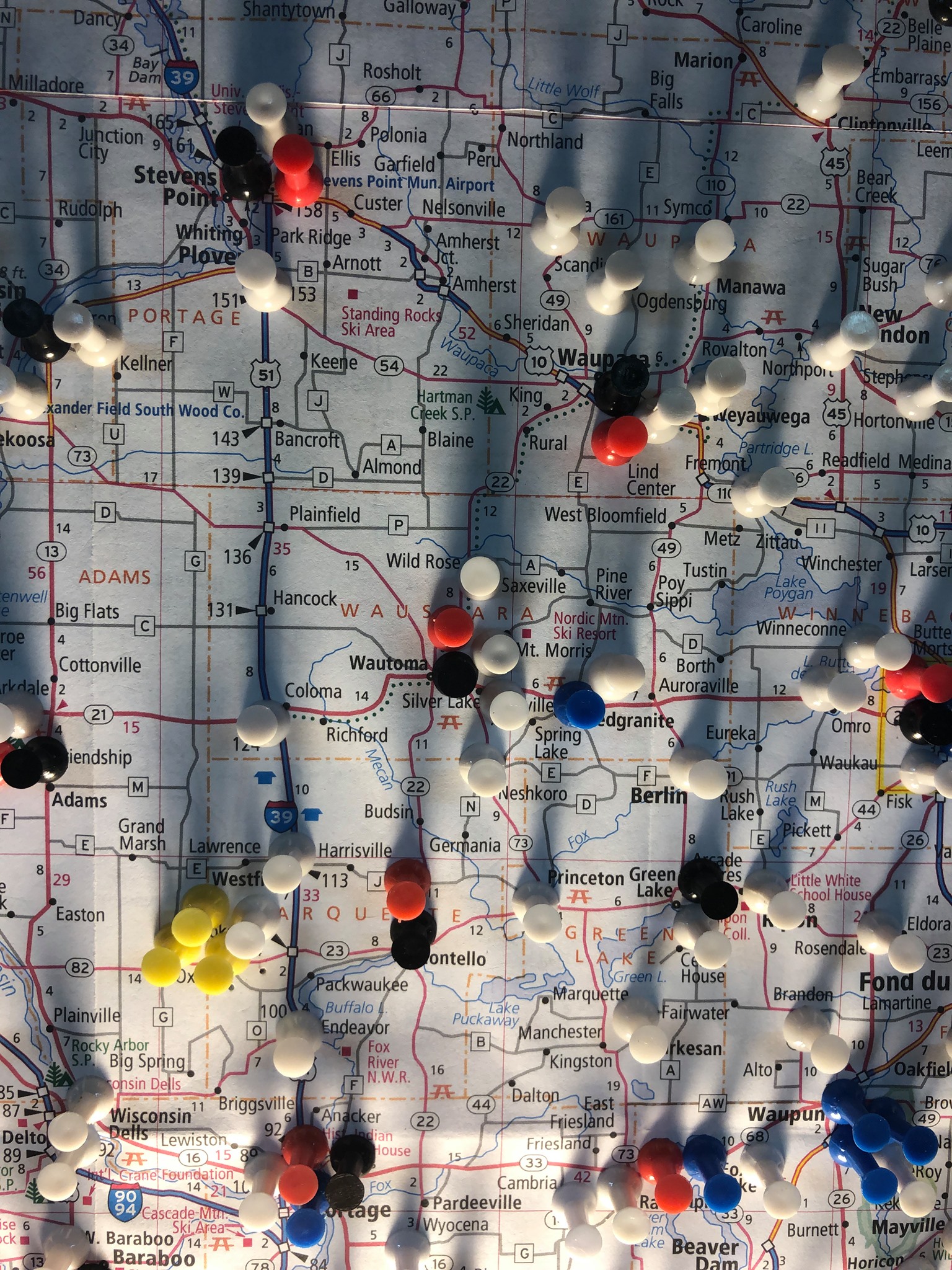 don’t know of caging sites that are close by. “Pinned Down,” through the use of state maps and pushpins, evidences the geography of incarceration that blankets the nation. Included alongside the maps are issues central to our imprisoning culture, and pieces from the artist’s earlier “Crazy for Cages” show.