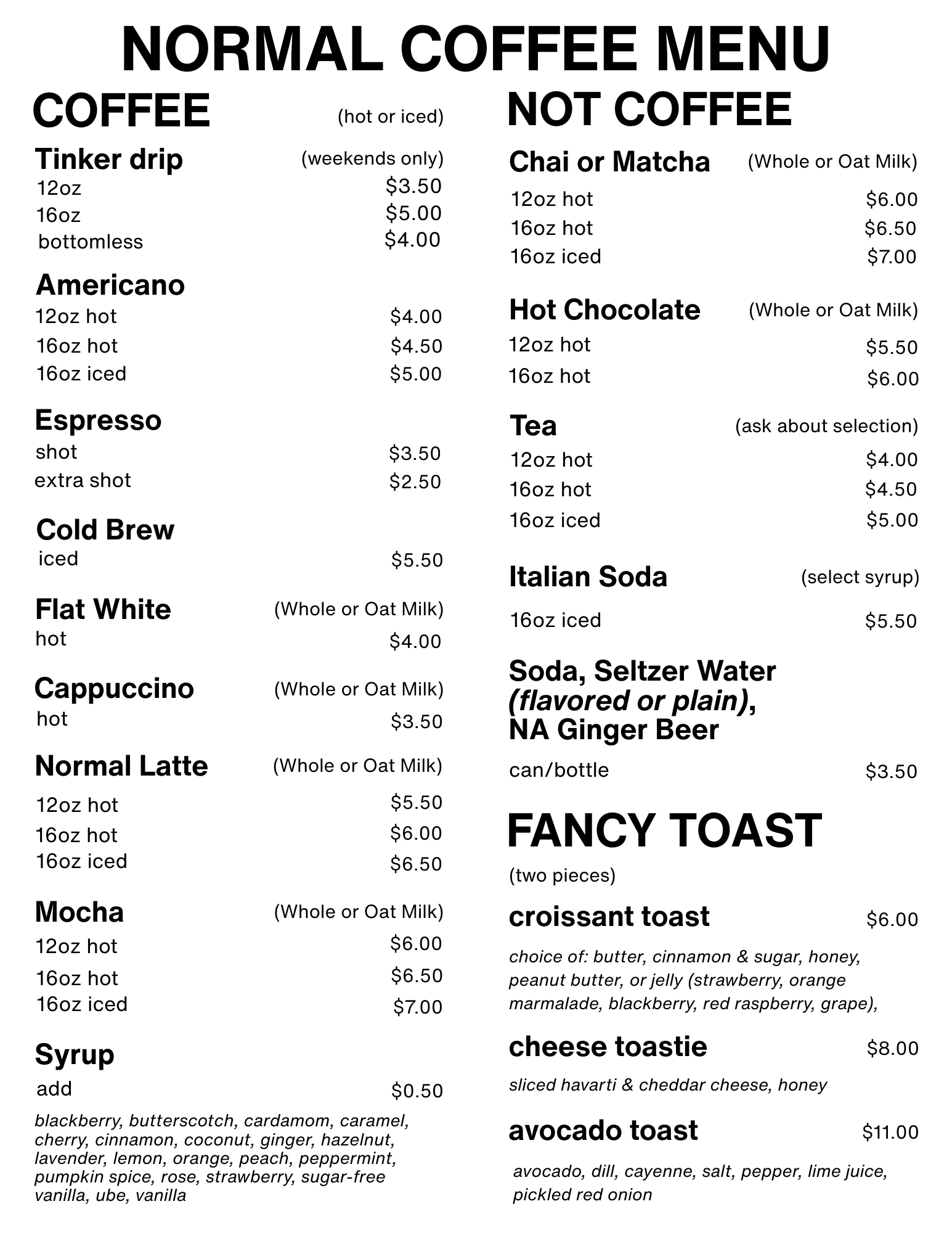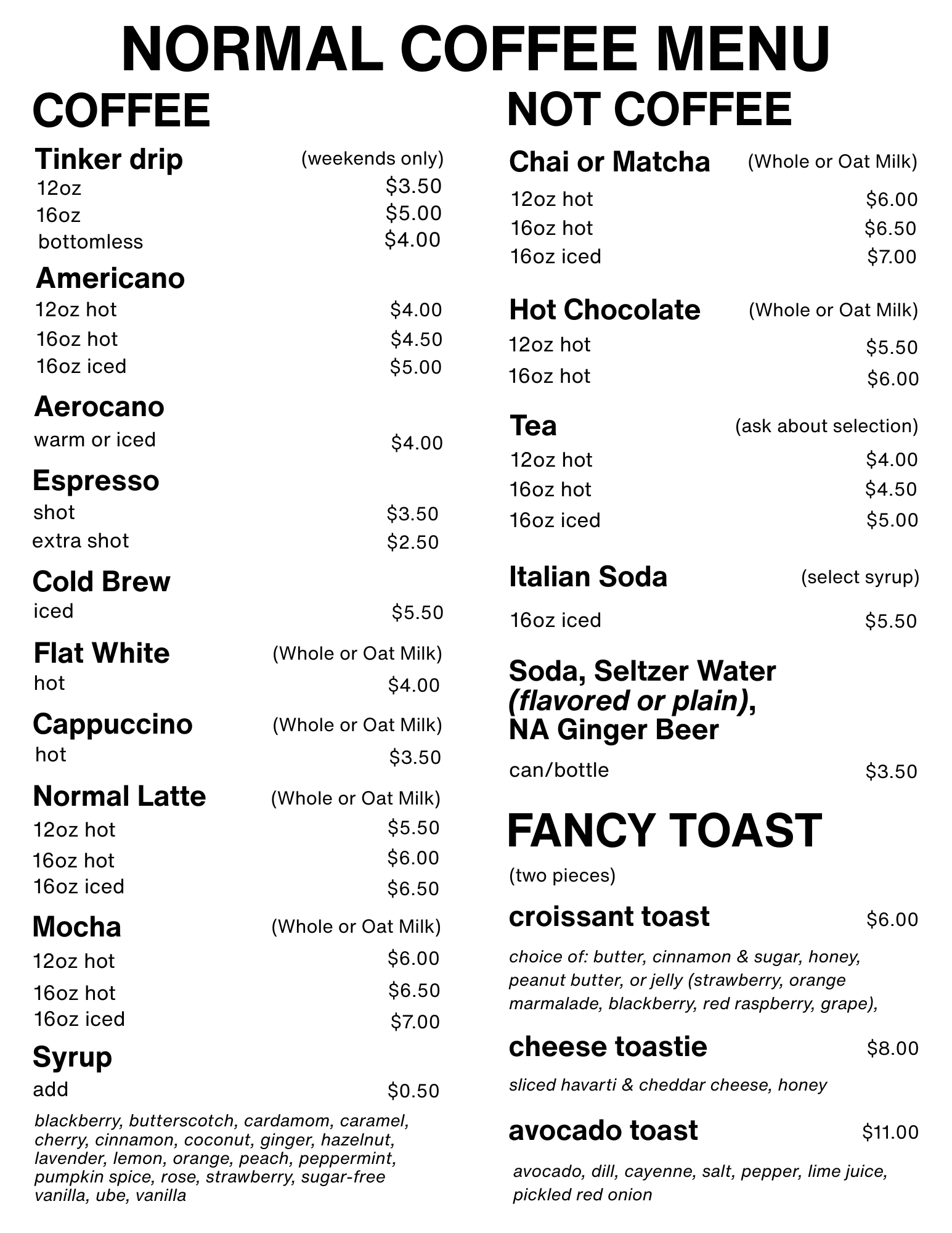 Normal features delicious Indianapolis-based Tinker Coffee as its primary beans and sells a variety of drinks, including with flavored syrups, a variety of dairy and non-dairy milk options and other specialties. Normal also offers a few different fancy (but affordable) toasts for breakfast, lunch or snack time – using special croissant toast. Toasts include avocado, cheese, peanut butter, cinnamon, and jellies.