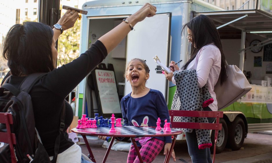 Our artist-led work activating the Circle included free, low-key programming and infrastructure: drop-in games, music, bistro-style seating on platforms known as parklets, conversation, the Wagon of Wonders, historical characters, fitness, and more, co-presented by a great roster of partners.